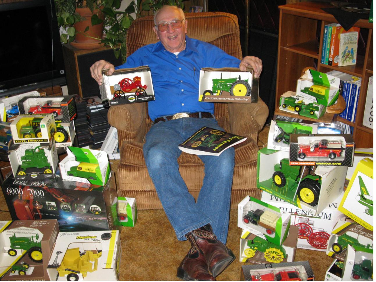 After the three of us stuffed ourselves, we retired to the living room. Originally we were planning on a good game of bowling on the Wii. Sharon's dad loves to bowl on the Wii. However, Sharon suggested I show her dad my John Deere toy collection. Well, needless to say, that took up the remainder of the afternoon. (smile) Sharon's dad is a farmer so many of the Ertl John Deere toys he was very familiar with. I couldn't resist the moment. I surrounded him with the toys as I brought them out to show him... then I snapped this photo. Her dad is so cool! (smile) The photo turned out fantastic so we printed it out on photo paper so her dad could show what Santa brought him. (chuckling) It was a SUPER WONERFUL day.