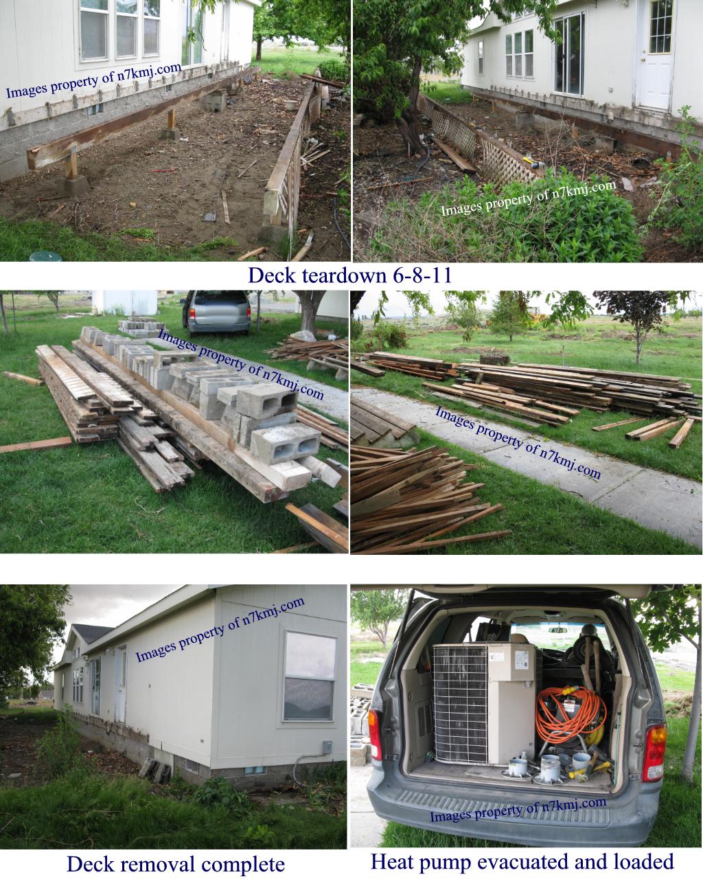 Sharon's father loaned us one of his wheat trucks to help with hauling home the decking and blocking materials. I hired an air conditioning company to come and evacuate the heat pump. They pulled down the system and stored the freon in the compressor unit. We loaded it up in the mini-van and hauled it home. So far so good.