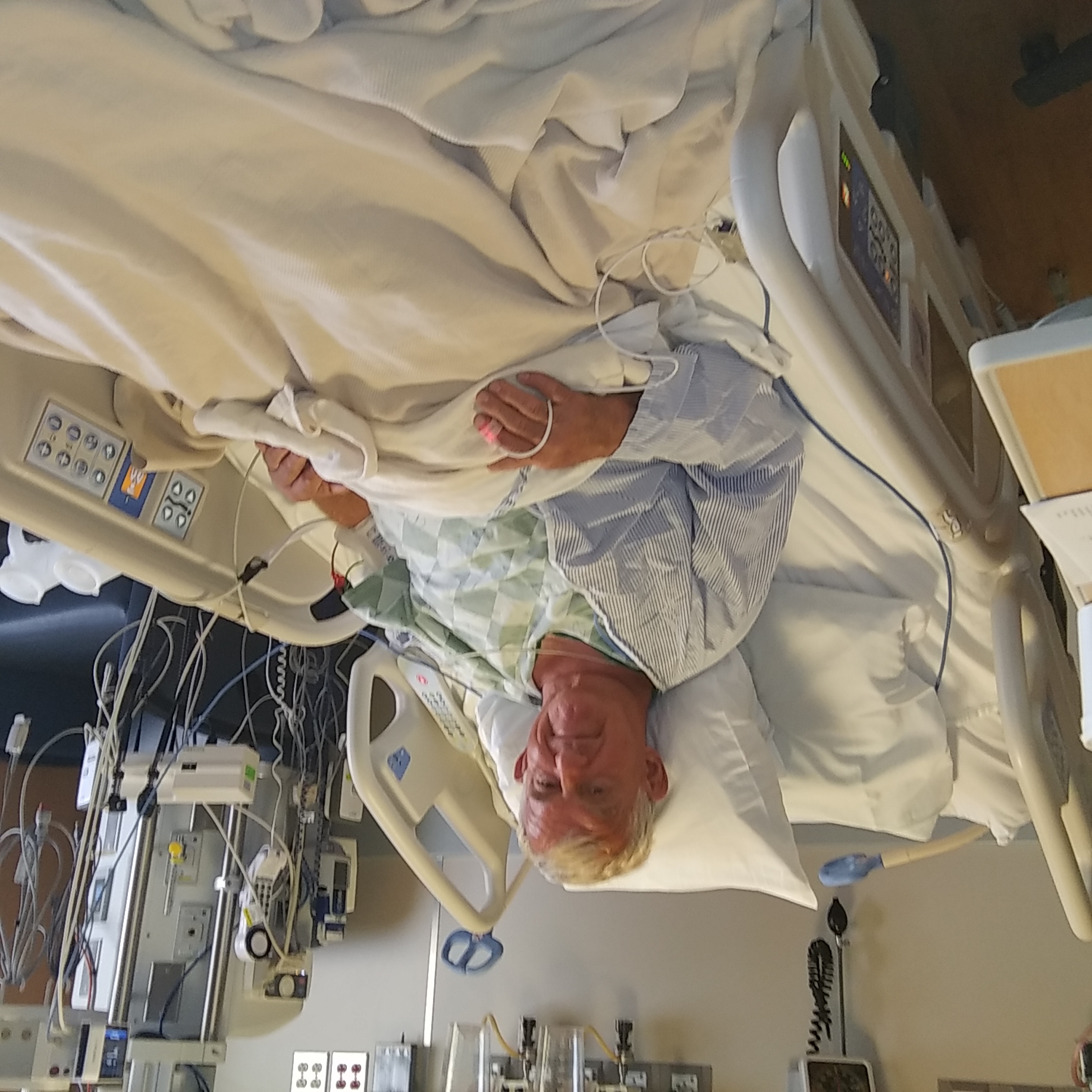 Five hours later, I woke up in the intensive care unit. Once time allowed the fog to lift, attendents were making sure I was comfortable and that all my vital signs were ok. This was me in ICU.The cardiologist stopped in to update me on the procedure. He said everything went great and that he was successul in placing all four stents in four main arteries via a tiny incision in my right wrist. That thought didn't sink in at the moment, but later I thought about the route he took to reach those four blocked arteries. Wow! I later told him that he definately was not being paid enough! Truly amazing! After an overnight stay in ICU, I was released the next day shortly before noon. Walking out of the hospital, life seemed to have taken on a different hue.