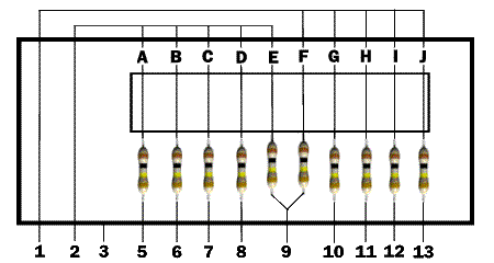 1. Select PL tone required from Frequency chart. 2. Count the number of columns with X's and obtain that number of 100k resistors. 3. Install the resistors as shown in the diagram below in the columns A thru J that have X's from the table. Example: Tone 229.1 (9Z) requires one 100k resistor between pins 2 and 5. Tone 136.5 (4Z) requires two resistors, one between pins 2 and 9, and one between pins 1 and 10. ![]() JU1 - Normally Out JU2 - Normally Out- Install for PL tone disable